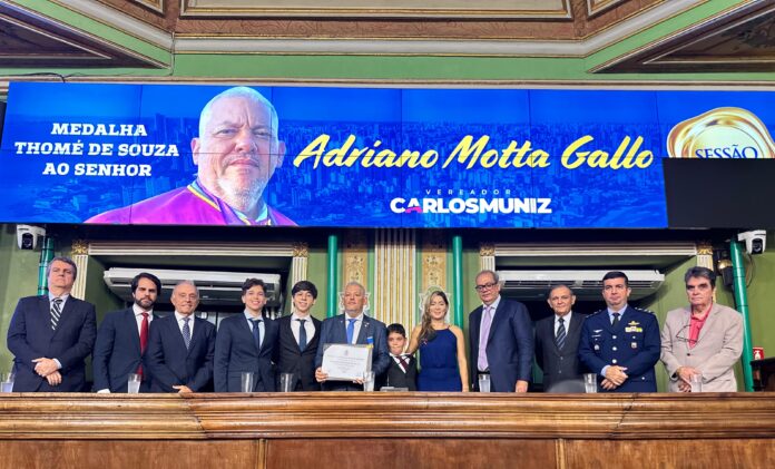 “Hoje, temos a honra de homenagear Adriano Motta Gallo, que recebe a Medalha Thomé de Souza, uma distinção que reflete seu comprometimento, esforço e a excelência em suas atividades. Esta medalha, concedida pelo então presidente desta Casa e atual vice-governador do estado, Geraldo Júnior, simboliza o reconhecimento de uma carreira marcada por dedicação e paixão pelo que faz”, disse Carlos Muniz.