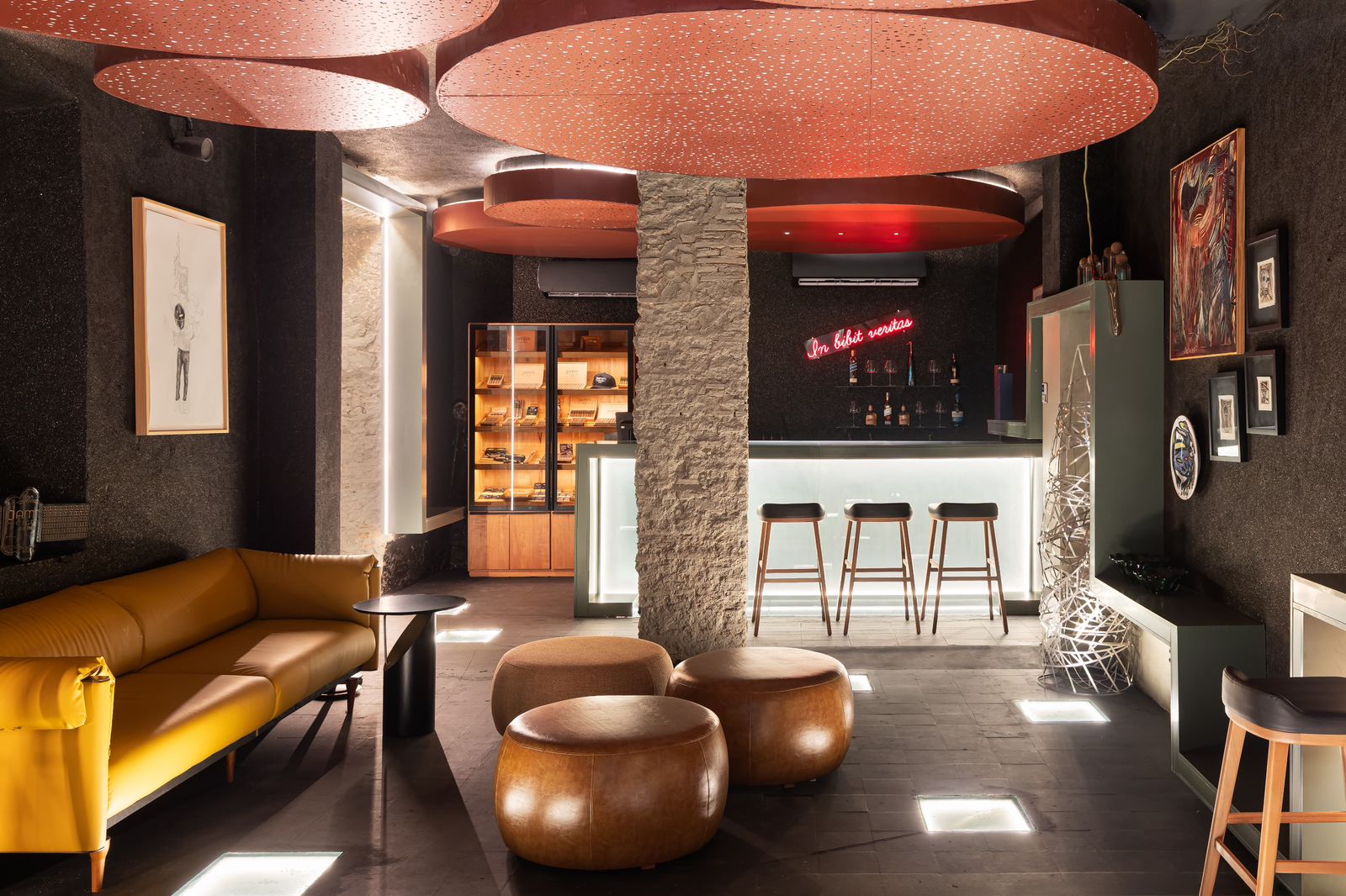 Com uma paleta de cores sóbria e materiais autênticos, o ambiente foi pensado para valorizar texturas e formas. A iluminação indireta e a penumbra suave criam uma atmosfera de mistério e acolhimento. O mobiliário, desenhado sob medida, evoca o luxo atemporal e é posicionado de forma a estimular conversas silenciosas, olhares atentos e presença plena.